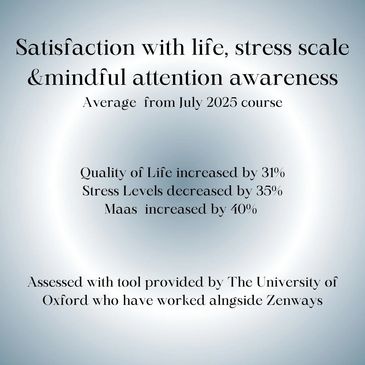 Working in collaboration with the University of Oxford, Zenways embarked on a research project some years ago to collect results data for this 8 week course. As teachers we continue to use these these tools to assess results. At the start and at the end each participant is asked to complete 3 surveys and these are the results. This is the sixth course I have taught- 2 since I graduated as a teacher. I delivered 4 of these as part of my training.
