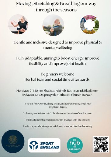 A 44-week mindful movement programme across the year for people in Darwen and Blackburn living with long-term illness who currently do under 30-60 minutes of exercise a week and want gentle support to build towards the NHS guideline of 150 minutes plus per week